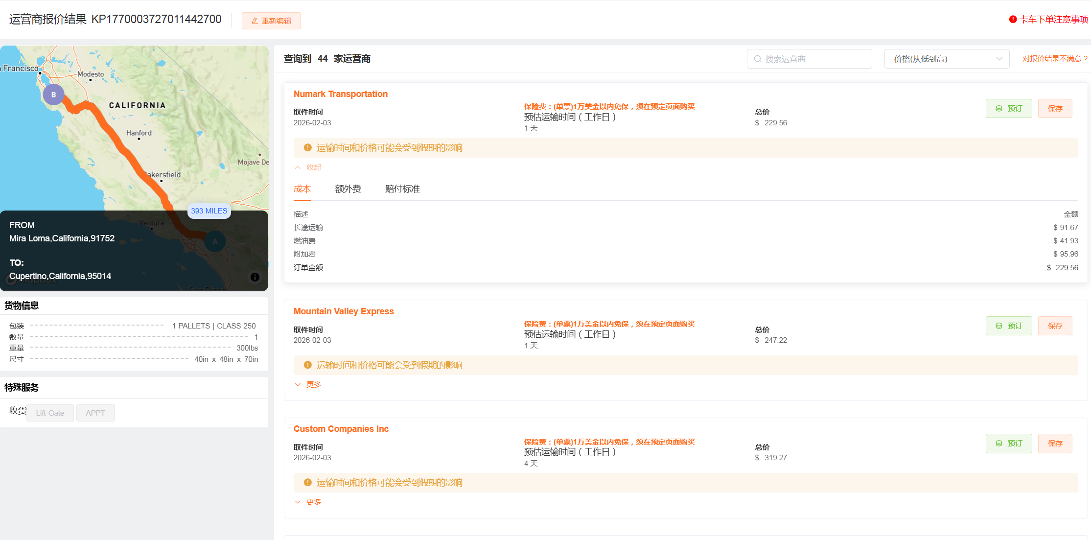 系统会根据你输入的信息计算出两地的距离,匹配附近可使用的卡司,从报价单上你可以看到多家卡司的报价和预估运输时间,点击更多还可以看到每家卡司具体的成本、额外费用、赔付标准明细,选择合适的卡司点击预订。